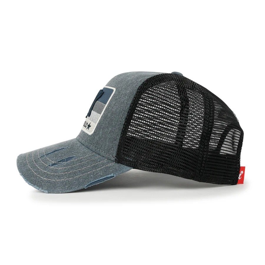 COLOR AZUL SUAVE CON NEGRO, CON MALLA, CIERRE AJUSTABLE