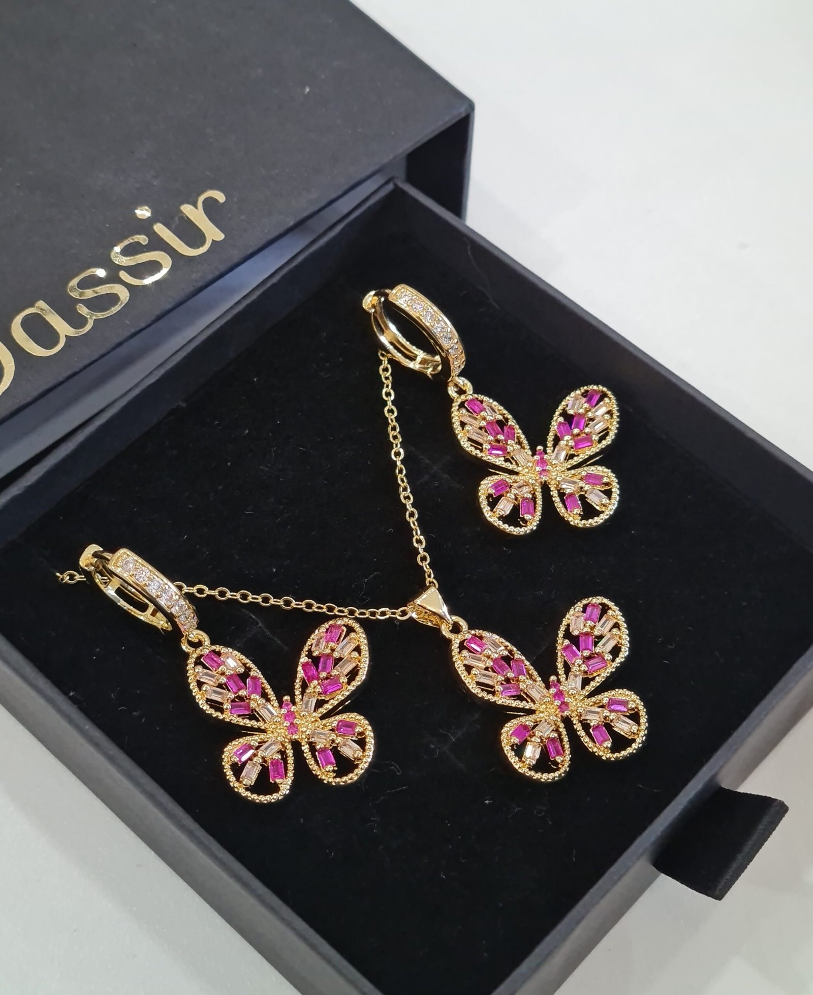 Incluye: Aritos + Cadena con dije. Material: Brass (baño oro) con circonias
