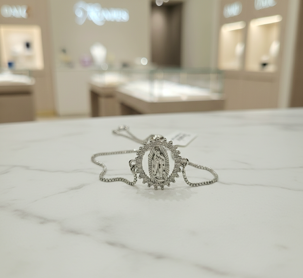 Material: Estilo Cadena, Dije de Virgen de Guadalupe en Brass(Baño de Plata)y Circonia.