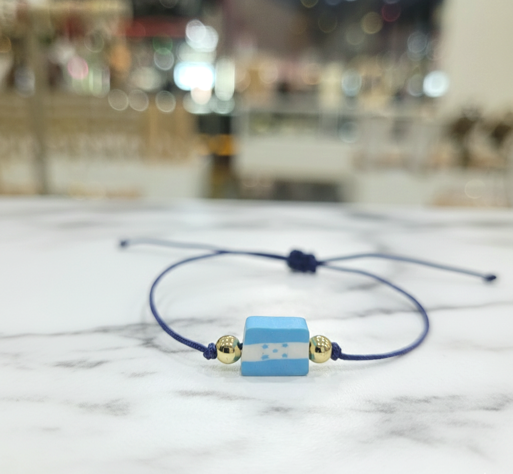 Material: Hilo de Chino Azul, Balines en Brass(Baño de Oro) y Dije de bandera Honduras en Silicon