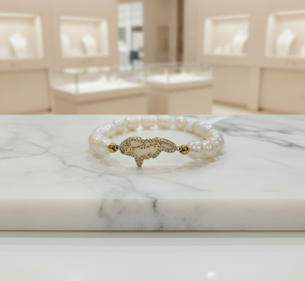 Material: Perla Cultivada, Balines en Acero, Dije de Mapa Honduras en Brass (Baño Oro) Concha Nácar y Circonia.