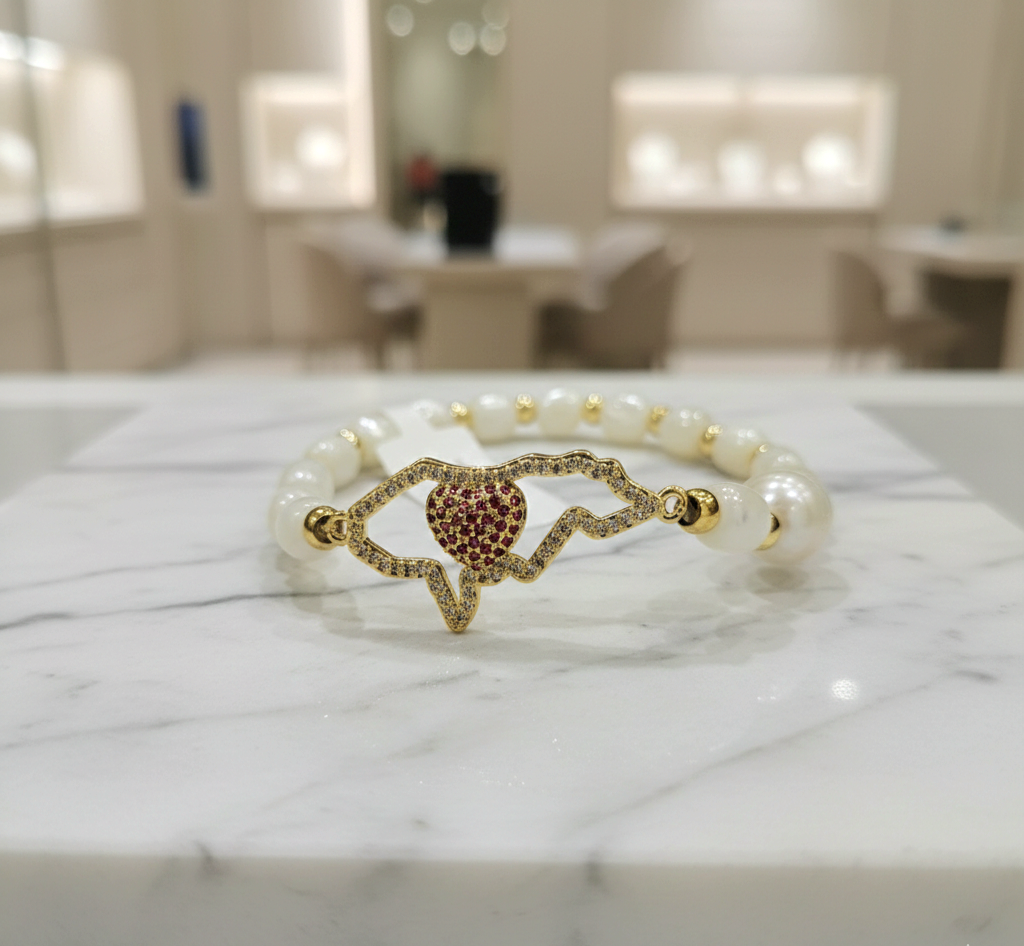Material: Concha Nácar, Dije de Mapa Honduras, Balines en Brass (Baño Oro) Circonia y Perla Cultivada