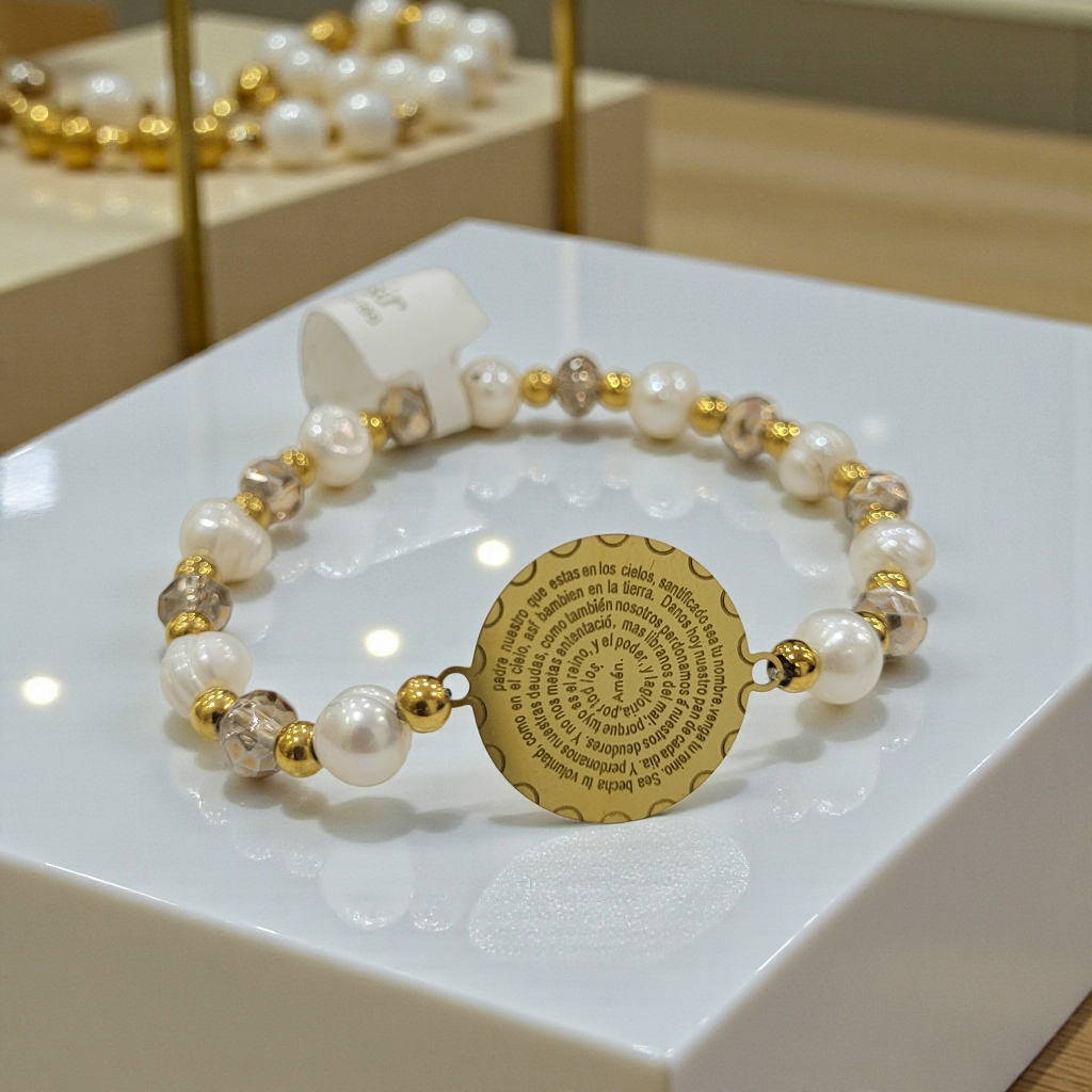 Material: Perla de río, cristal, Acero Inoxidable. Pulsera de Oracion el Padre Nuestro