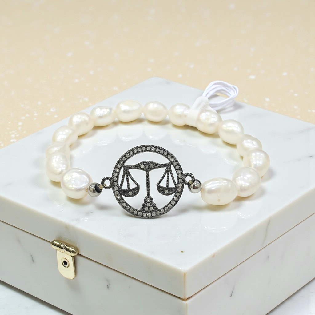 Material: Perlas Cultivas, Dije de Balanza de la Justicia en Brass(Baño de Rodio ) y Circonia