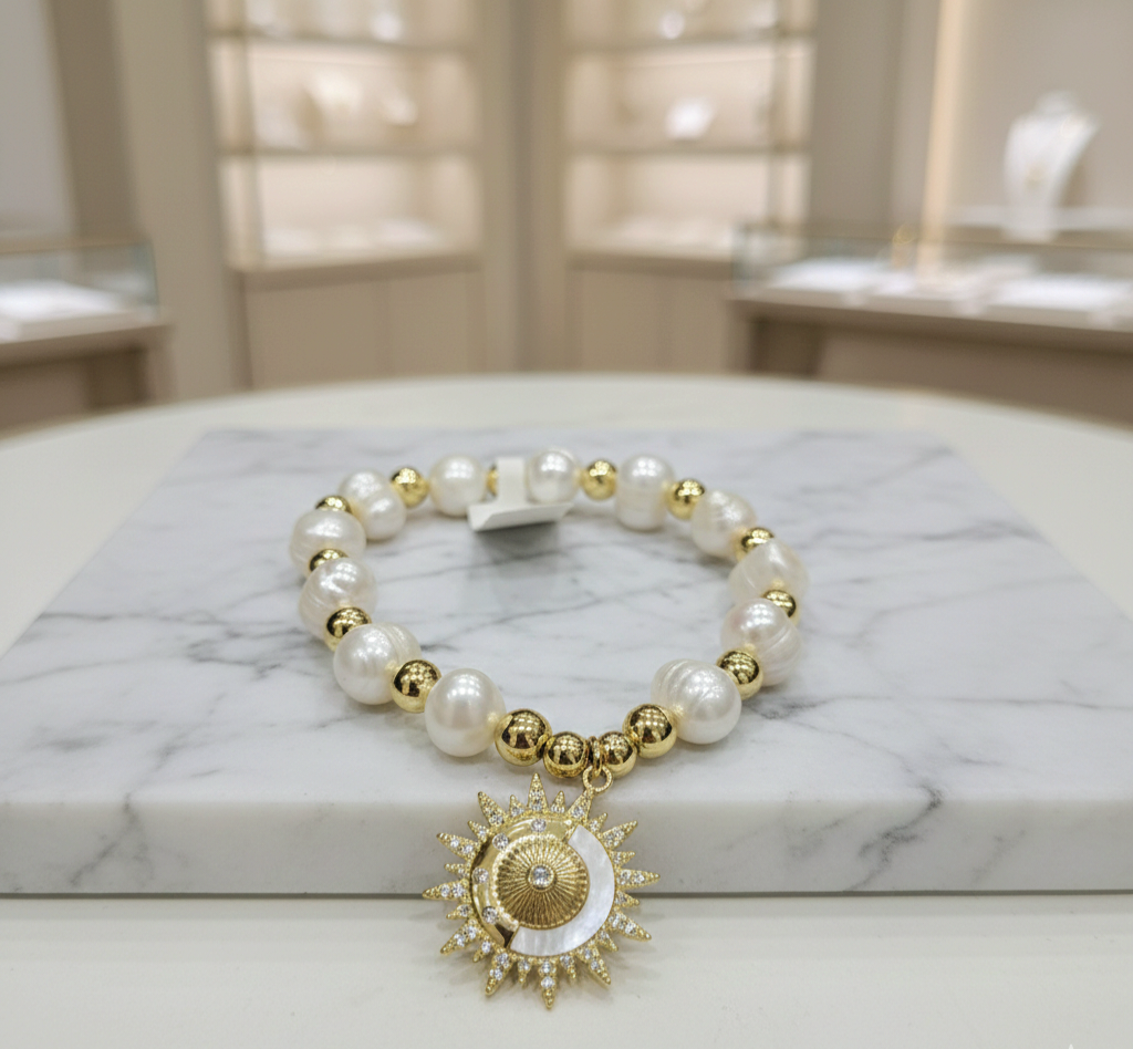 Material: Perlas Cultivas, Balines, Dije de Sol en Brass(Baño de Oro)y Concha Nácar