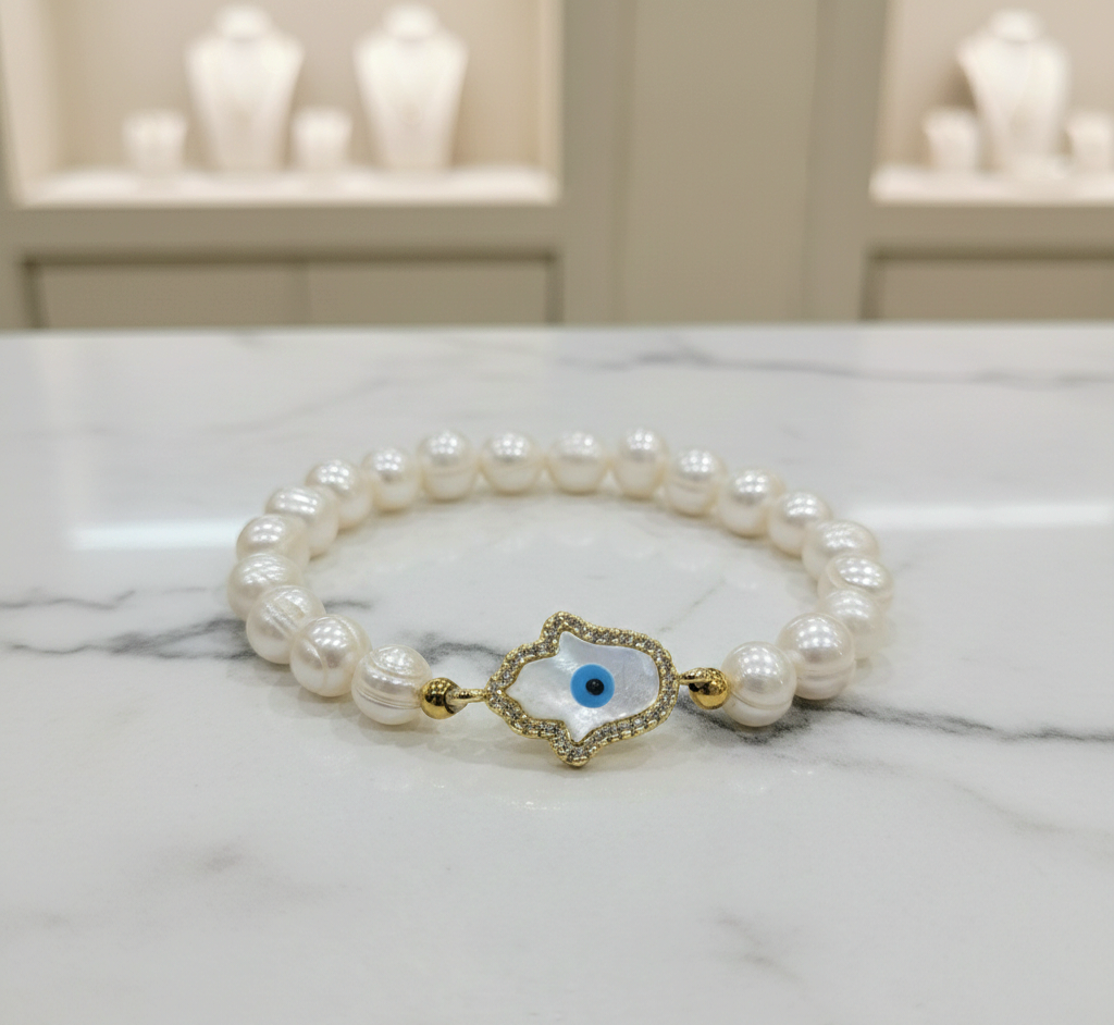 Material: Perla Cultivada, Balines en Acero, Dije de Ojo Turco en Brass(Baño de Oro), Circonia y Concha Nácar.