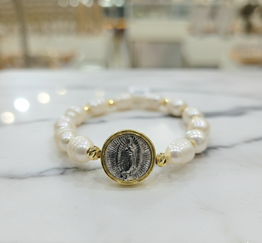 Material: Perla Cultivada, Balines, Dije de Virgen de Guadalupe en Brass(Baño de Oro y Plata).