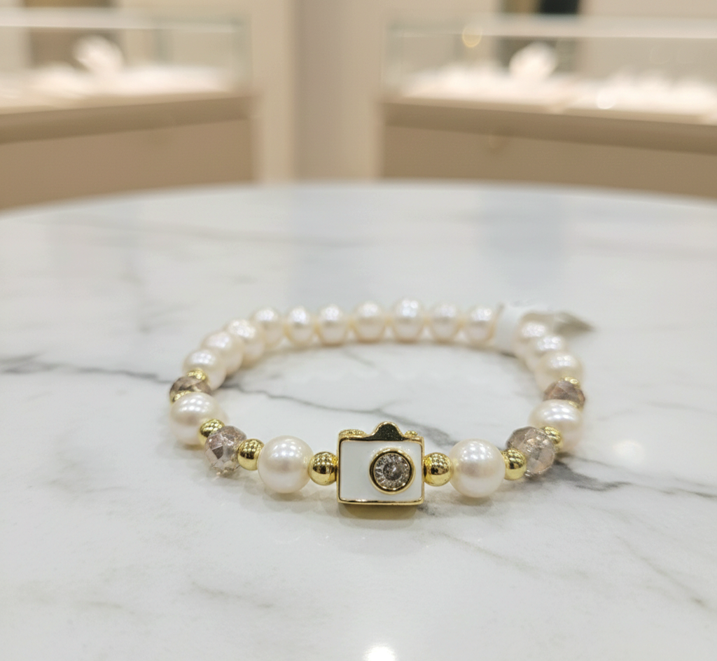 Material: Perlas Cultivadas, Cristales, Balines, Dije de Camara en Brass(Baño de Oro).